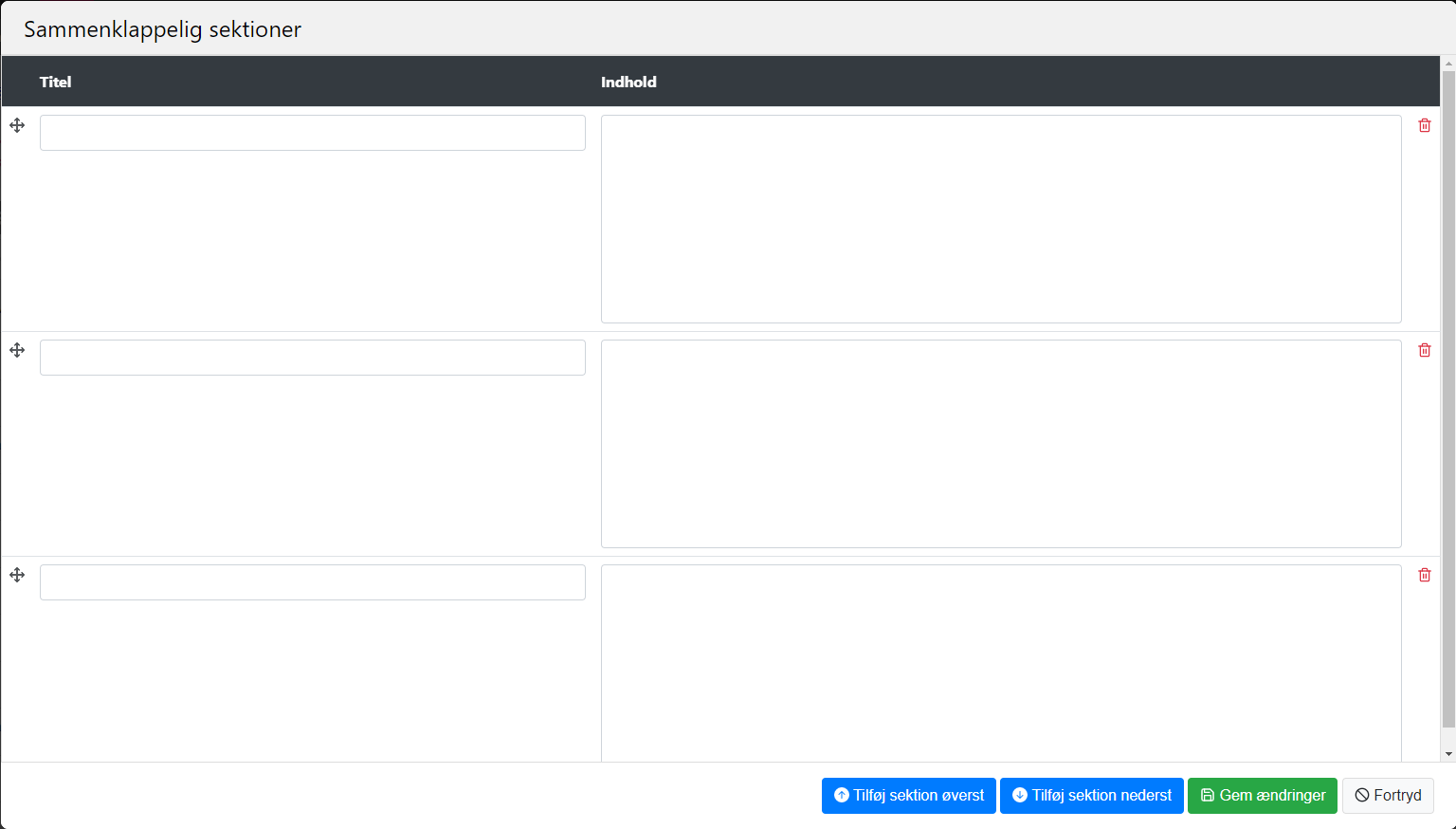 - Hvis man evt. skulle oprette flere sektioner, man kan benytte "Tilføj sektion øverst" og "Tilføj sektion nederst".