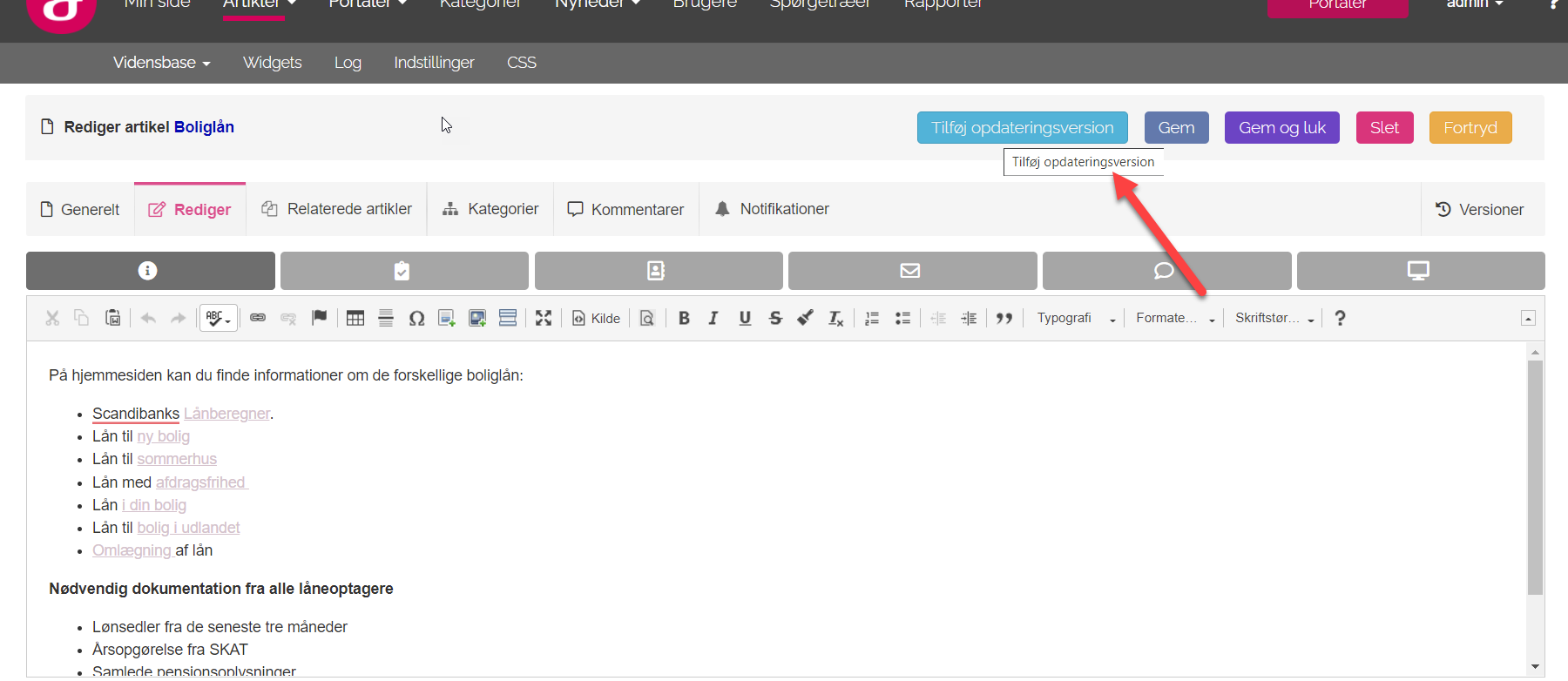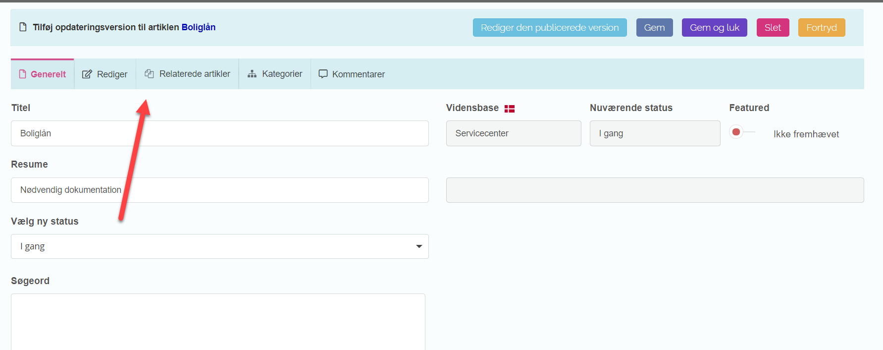 - Rediger artiklen, som du normalt ville redigere en artikel og gem løbende. Artiklen bliver først publiceret nu du aktivt vælger at publicere den nye version.