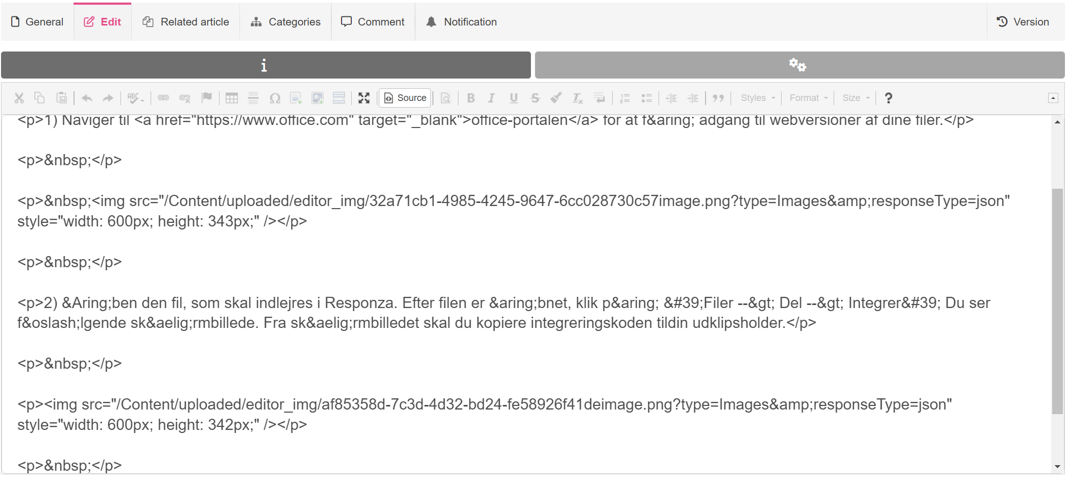 3) Tilbage i Repsonza-artiklen/nyheden skal du klikke på knappen 'Source' i værktøjslinen. Her er HTML koden til artiklen og det er det muligt at indsætte indlejringskoden. Derefter vil Office filen være tilgængelig.
