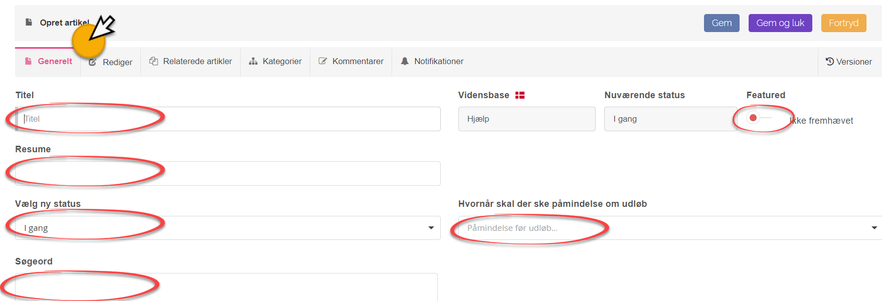 Nu lander du på artikeloprettelsessiden, hvorfra du har adgang til flere faneblade