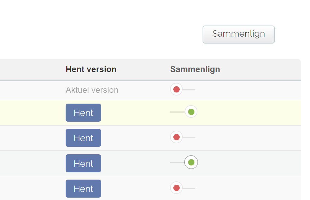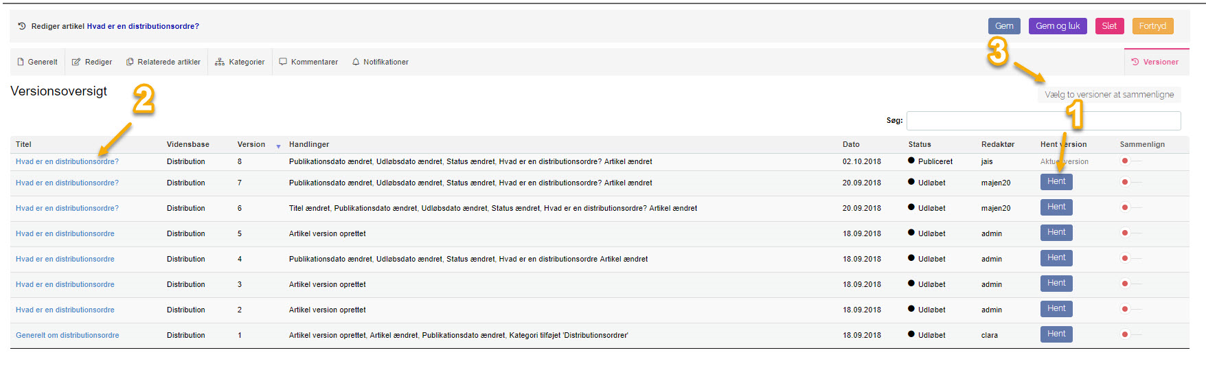 - Vælg 2 versioner og tryk på 'Sammenlign' for at sammenligne artiklerne. (Knappens tekst skiftes til 'Sammenlign', når 2 versioner er valgt)