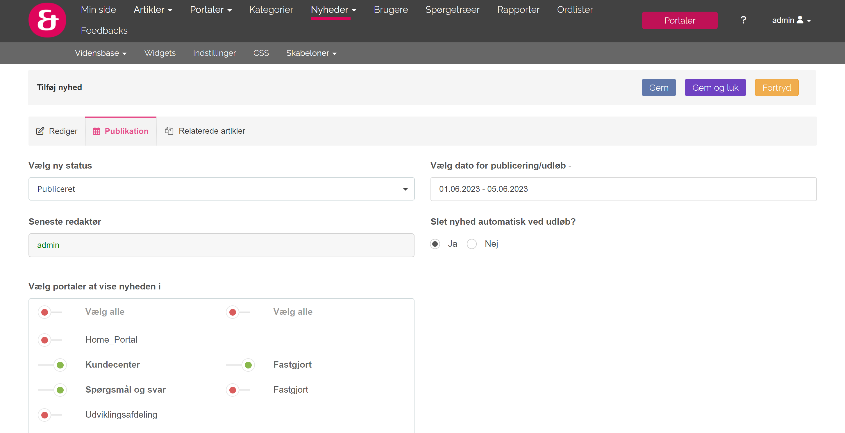 • Hvis du ønsker at nyheden skal slettes ved udløb, skal "Ja" være valgt, ellers hvis "Nej", forbliver nyheden i nyhedsoversigtssiden.