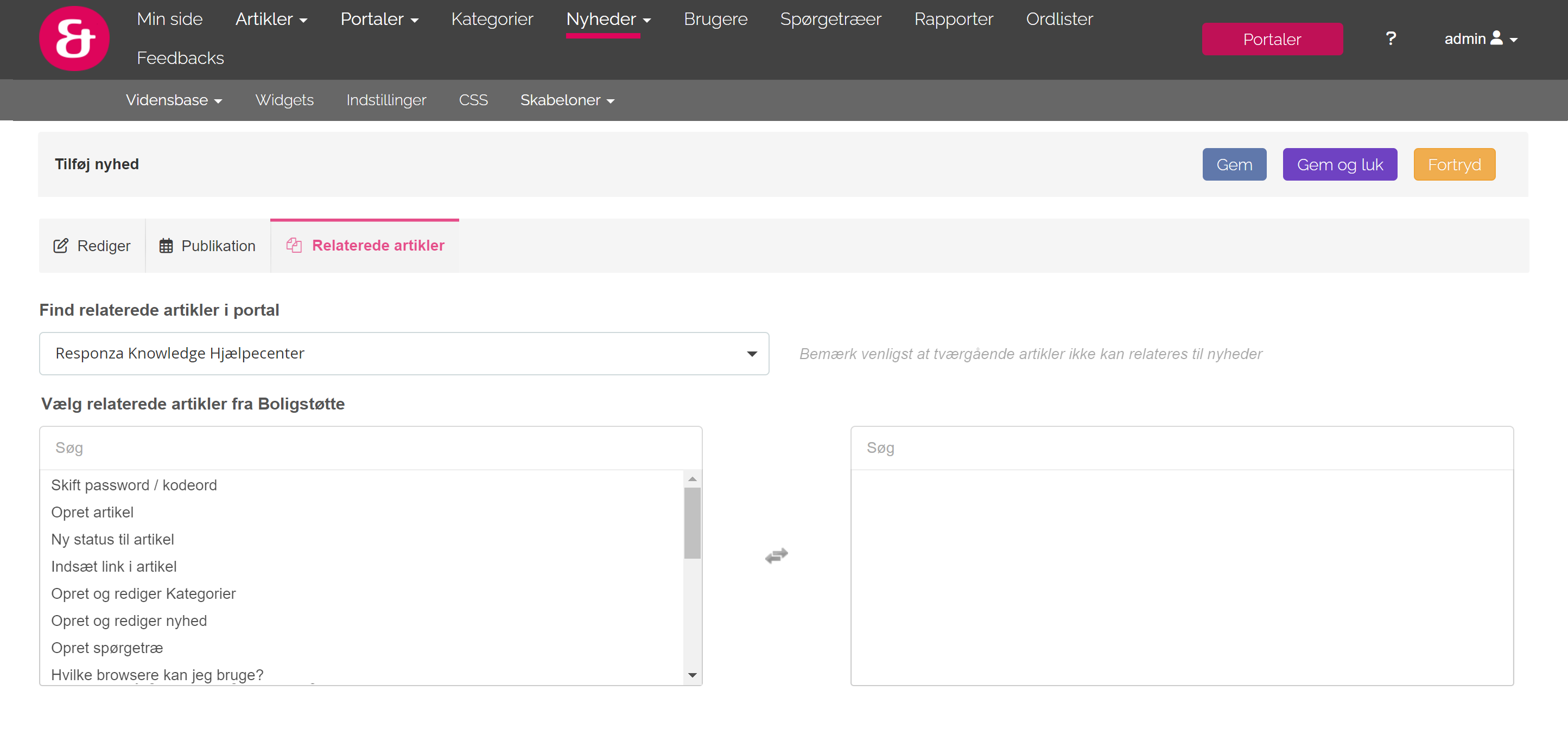 1. Under fanen Relaterede artikler, kan du relatere eventuelle relevante artikler til den nyhed, du har oprettet.