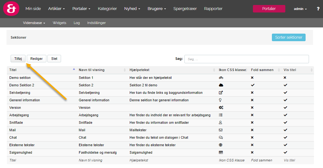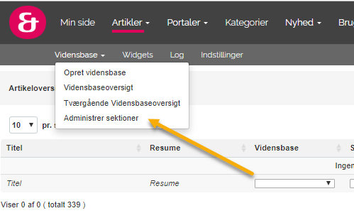 Hvis du ønsker at oprette en ny sektion, skal du gå til 'Administrer sektioner' og vælge 'Tilføj'